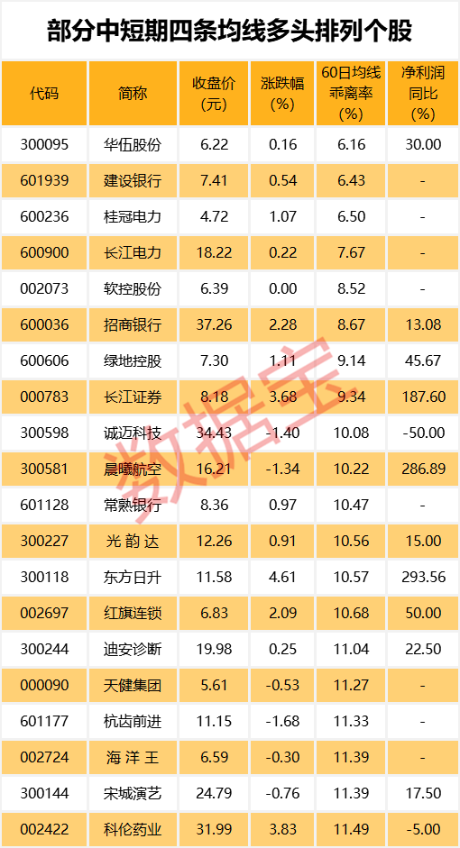截至7月25日,66只个股5日、10日、20日、60日四条均线近日呈多头排列。其中华伍股份、建设银行、桂冠电力股价与60日均线的乖离率最小,分别为6.16%、6.43%、6.50%。
