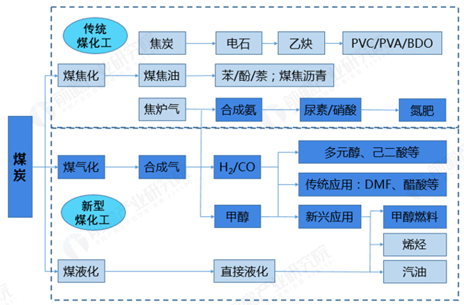 煤化工技术是指以煤炭为主要原料,通过特定工艺过程生产出各种能源或化工产品,煤化工产业可划分为传统煤化工和现代煤化工两类。其中,传统煤化工主要涵盖煤炭炼焦、煤制合成氨、煤制甲醇以及煤制电石-乙炔-聚。