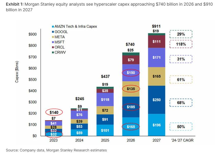 基于最新指引,摩根士丹利股票团队大幅上调预测,预计2026年超大规模云服务商的资本支出将达7400亿美元,较年初预测的5700亿美元激增。其核心逻辑依然稳固:算力需求持续大幅超过供应。