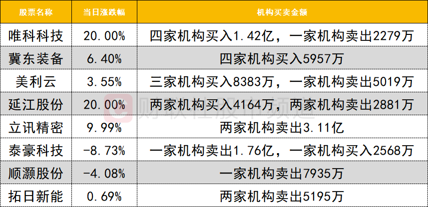 今日龙虎榜机构活跃度较高,叠加光纤、机器人、福建三大热点概念,唯科科技今日20cm涨停,获四家机构买入1.42亿。立讯精密遭两家机构卖出3.11亿。