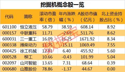 证券时报·数据宝统计显示,工程机械板块中涉及挖掘机产业链的公司中,恒立液压、三一重工、中联重科、徐工机械、潍柴动力和柳工获北上资金持股占比最高,均超5%。