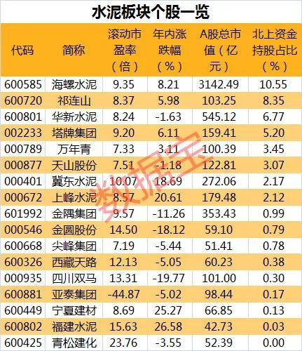 水泥板块中,多家上市公司股价表现稳健,跑赢大盘,其中福建水泥、宁夏建材和上峰水泥年内股价累计涨幅超20%。