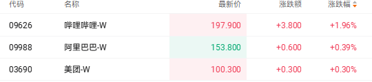 截至发稿,哔哩哔哩-W(09626.HK)涨1.96%、阿里巴巴-W(09988.HK)涨0.39%、美团-W(03690.HK)涨0.30%。