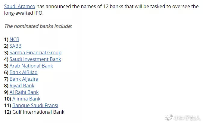 但是,从11月3日已经确定下来的IPO投行来看,基本集中在沙特利亚德银行、海湾国际银行等中东银行头上,共计12家银行。
