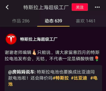 2月21日晚间,特斯拉上海超级工厂在官方抖音号上回复用户时表示,“请留意四月特斯拉的电池发布会,无钴,不代表一定是磷酸铁锂。”虽然不久后特斯拉立刻删除了此条评论,但是该消息还是被广泛截图转发,进一步引发了市场对特斯拉新电池的猜想。