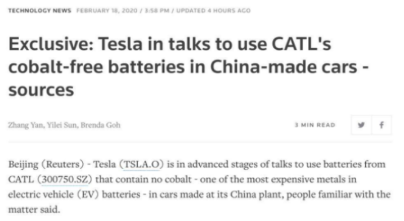 2月18日,据路透社报道,特斯拉正在与宁德时代商谈,中国产特斯拉将使用无钴电池,若这一谈判最终落地,意味着磷酸铁锂(LFP)电池将进入特斯拉生产线。