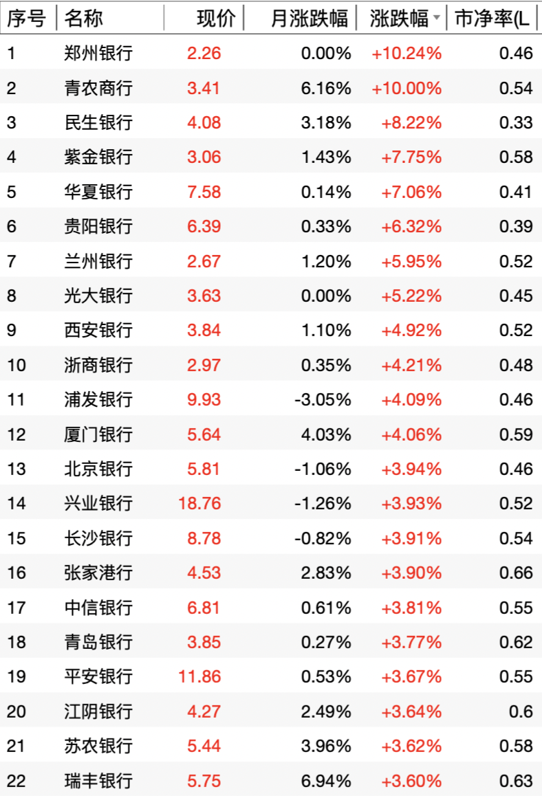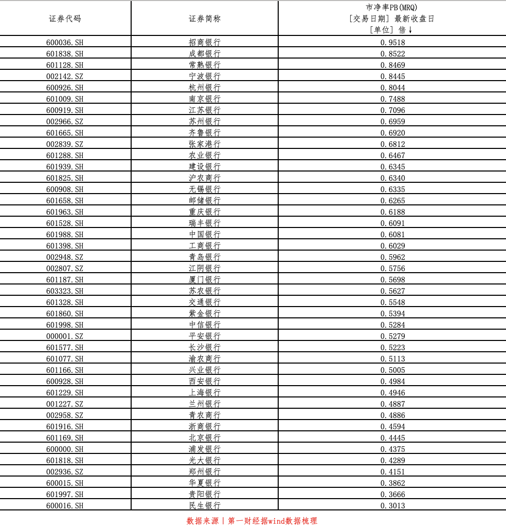 第一财经据Wind数据统计,当前A股上市银行均处于破净状态,市净率中位数仅为0.57倍,在A股行业板块中处于倒数第一,其中12只个股市净率低于0.5倍。市净率最低的分别是民生银行、贵阳银行、华夏银行,市净率徘徊在0.4下方水平,但上述3只个股18日均录得较大涨幅,截至收盘,分别上涨7.43%、4.99%、5.08%。