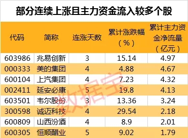 值得注意的是,105只连续上涨个股中,17只个股期间主力资金累计净流入超过亿元。其中,累计资金流入最多的为兆易创新,主力资金累计流入4.97亿元。