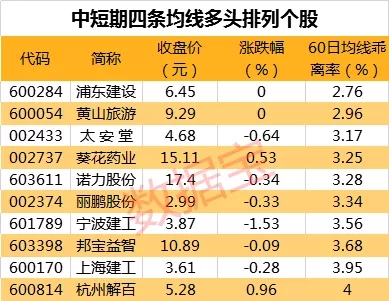 截止最新,458只个股5日、10日、20日、60日四条均线近日呈多头排列。其中浦东建设、黄山旅游、太安堂股价与60日均线的乖离率最小,分别为2.76%、2.96%、3.17%。