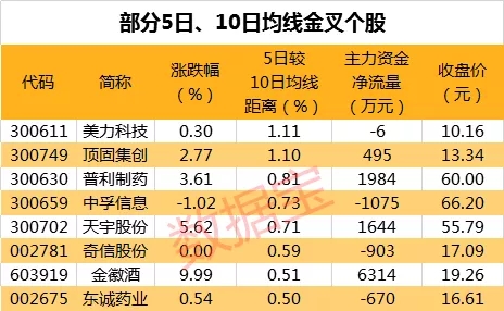 截至最新收盘,有34只A股的5日均线主动上穿10日均线,其中美力科技、顶固集创、普利制药等个股的5日均线较10日均线距离最大,分别达1.11%、1.10%、0.81%。