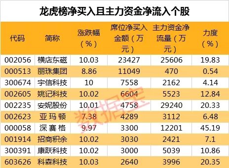 速看!龙虎榜净买入且主力资金净流入个股一览