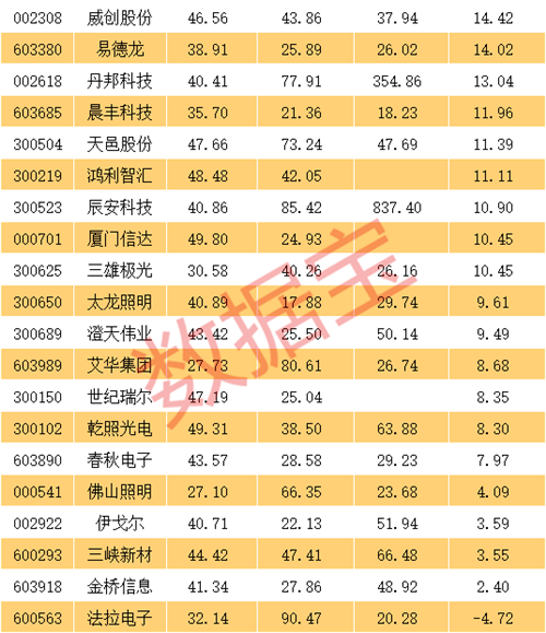 从市值角度看,太龙照明最新市值不足18亿元榜单最低;晨丰科技、华脉科技、伊戈尔等个股市值在25亿元以下。市值较高的个股则有江丰电子、法拉电子、洁美科技等。