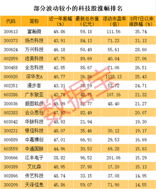 部分窄幅震荡时日已长的小市值科技股,在本轮行情中已经开始大幅突破。其中,富瀚微8月7日以来大涨35.74%,创出近一年来新高。扬杰科技位居涨幅榜次席,8月7日以来涨幅超过31%。