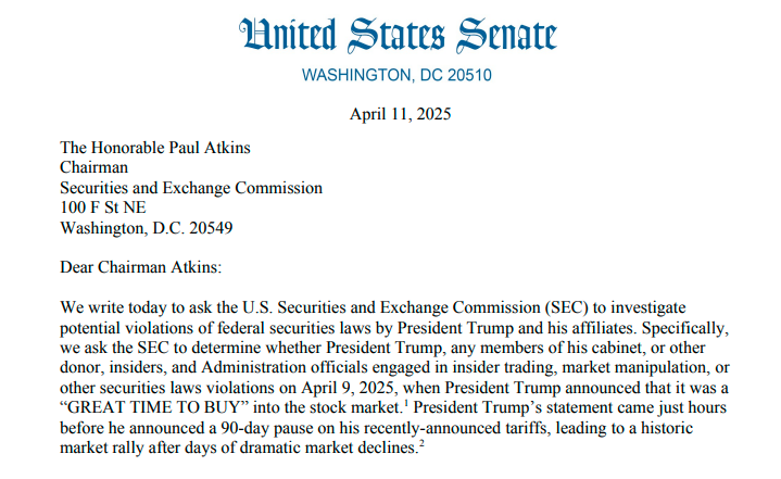 “具体而言,我们要求SEC查明特朗普总统、其内阁成员、捐助者、内部人士或政府官员是否在2025年4月9日——即特朗普总统宣称‘现在正是买入良机’的当天,从事了内幕交易、市场操纵或其他违反证券法的行为。特朗普总统的这一声明发表仅数小时后,他便宣布对其近期实施的关税政策实施90天暂停,此举引发市场在连续多日暴跌后出现了历史性的反弹,”这份联名信中写道。