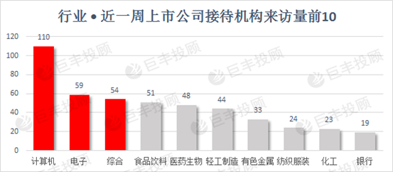 从行业调研数据上看,计算机行业最受机构关注,调研总量达110次,其次是电子行业调研总量为59次,综合行业调研总量为54次,另外还有诸多行业受到机构密集调研。