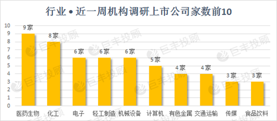 从行业调研家数看,医药生物、化工、电子三行业调研家数最多,分别有9家、8家、6家上市公司被调研,另外轻工制造、机械设备等行业有多家上市公司被调研。总体看,医药生物是本周重点调研的行业。