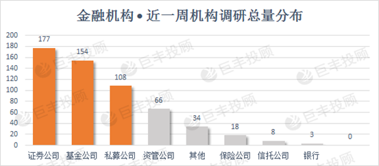 从机构活跃度来看,本周调研最活跃的是证券公司,共调研177次,其次是基金公司,调研次数达到154次,另外私募和资管公司数据也比较靠前,分别为108次和66次。
