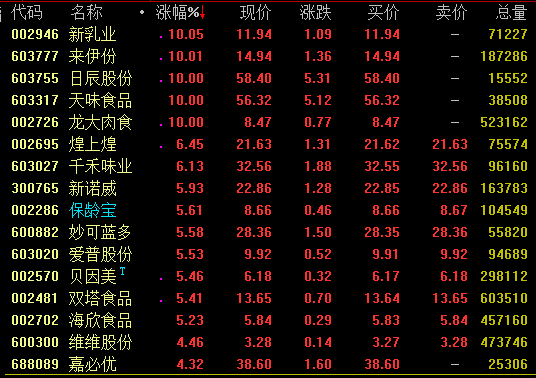 食品板块今日盘中发力拉升,截至收盘,新乳业、来伊份、日辰股份、天味食品、龙大肉食等涨停,煌上煌、千禾味业涨幅超6%。