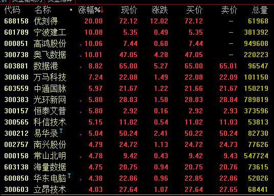 受政策利好刺激,IDC概念今日盘中发力上扬,截至收盘,优刻得(科创板)、宁波建工、高鸿股份、奥飞数据等涨停,数据港涨近9%,万马科技涨逾7%。