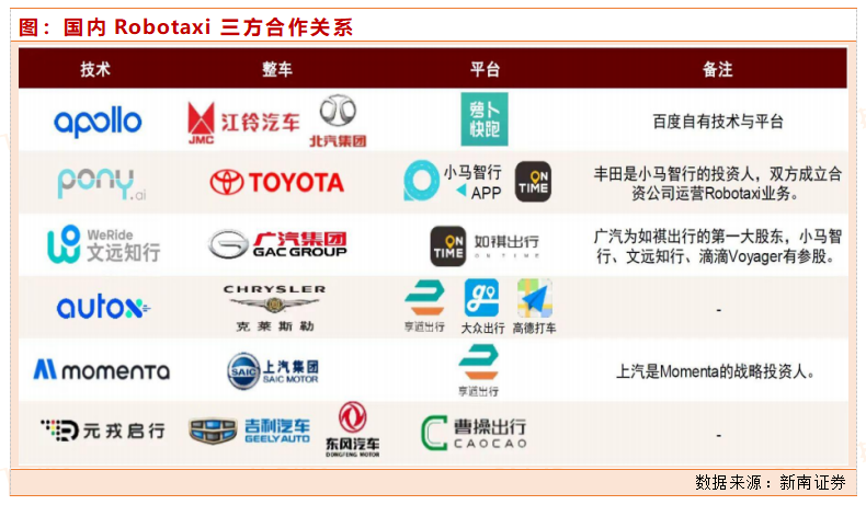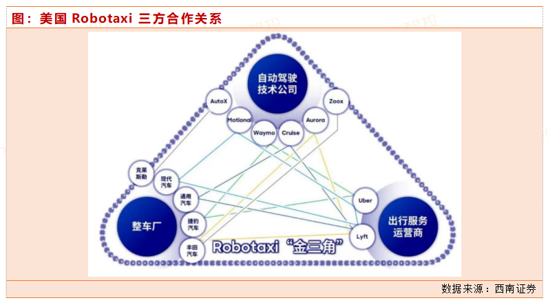 Robotaxi生态三个环节,分别是技术,整车和平台,三者紧密合作发挥巨大合力。技术上,即Robotaxi自动驾驶技术,处于生态核心地位,致力于L4及高阶自动驾驶技术算法的更迭与研。整车方面,整车制造厂,向自动驾驶技术厂商提供车型进行无人驾驶改装。而运营平台,是实现Robotaxi商业化落地的关键一环,优秀的运营平台可以调动已有资源,在宣传、用户体验上不断优 化,帮助Robotaxi商业化运营。