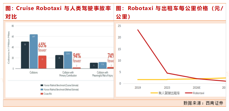 Robotaxi稳态价格更低。目前Robotaxi的运营成本(4.5元/km)高于有人驾驶出租车和网约车(1.8元/km),主要是由于 昂贵的硬件、软件、安全员,但随着技术的不断进步、运营效率的提升以及规模不断扩大,Robotaxi成本有望持续下降,根 据Frost & Sullivan预测,到2026年Robotaxi单价将与出租车持平,26年之后将低于出租车价格。