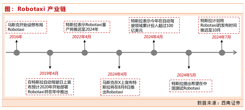 马斯克早在2016年就开始构想Robotaxi;2019年4月,特斯拉宣布2020年开始部署Robotaxi;2024年4月,马斯克表示将在8月8日推出Robotaxi,并表示今年在自动驾驶领域累计投入超过100亿美元。5月,特斯拉提出希望在中国测试Robotaxi。7月,特斯拉计划将Robotaxi的发布时间推迟至10月10日。