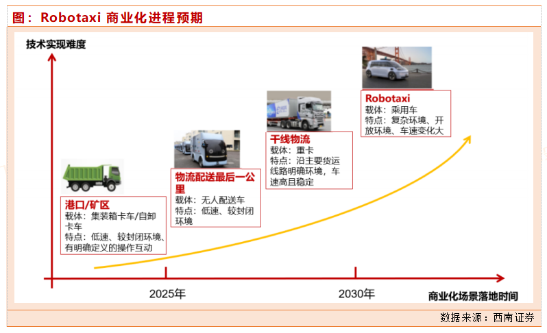 目前的Robotaxi还属于L4阶段,需要在特定路线下行驶,最终的形态是L5完全自动驾驶。从L4级别自动驾驶 的技术实现难度来看,Robotaxi是难度最高的,适用于复杂环境的乘用车,是L4自动驾驶最有想象力的市场。