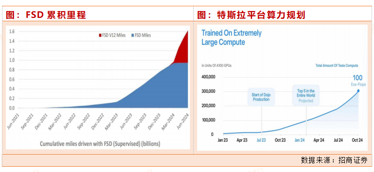 特斯拉拥有大量道路行驶数据,支撑着算法的更新迭代,截止2024年6月,FSD累计行驶里程达到16亿英里,其中FSD v12的行驶里程达到6亿英里。FSD的迭代以及Robotaxi所需的高阶自动驾驶技术都需要强大的算力来支持,截止2024年6月,特斯拉云端算力达到了35.5EFLOPS,领先于同行,并计划在2024年底前,将平台训练算力提升至100EFLOPS。8月公开了超算集群的名称 Cortex,可以容纳10万张H100/H200,专门用来训练特斯拉的FSD和Optimus。