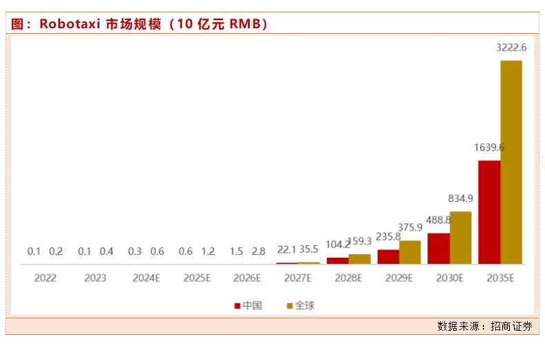 根据预测,2030年Robotaxi在中国智慧出行的渗透率将达到31.8%,2035年将达到69.3%。2030年中国和全球Robotaxi市场规模将分别达4888亿/8349亿元,24-30年CAGR分别为248%/239%,到2035年将分别达1.6万亿/3.2万亿元,30-35年CAGR分别为27.4%/31%。