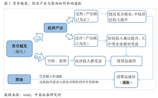 当超发的货币流入实体经济较多,经济过热(产出缺口为正)时,接近充分就业,利于居民(尤其是中低收入居民)收入的提升,从而更利于消费品价格的上涨,即通胀提升;相反,若超发的货币空转套利,经济过冷(产出缺口为负),则富人和大中型企业相对更受益,中低收入人群受益很有限,这种情况下投资品价格上涨的动力很大而消费品上涨就可能很有限了。