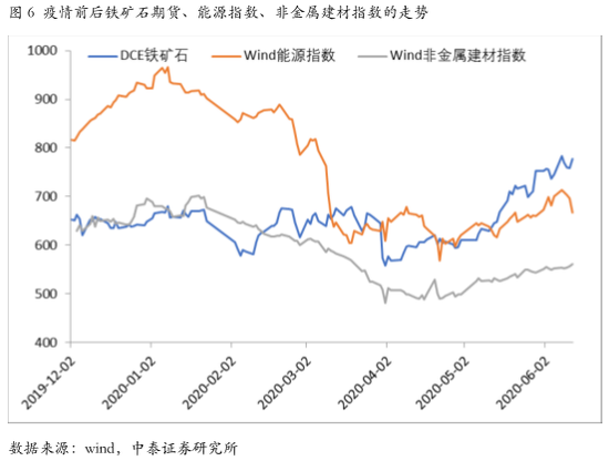 以铁矿石为例,主要是巴西疫情严重造成部分矿山停工,影响了铁矿石的供给。另一方面,由于中国疫情控制效果良好,4月份后进入基建旺季,且赶工的力度很大,造成短期对钢材的需求超出预期。这两方面的原因共同作用才使得铁矿石价格涨到超过疫情前的水平。如果看Wind非金属建材(期货)指数(也受基建旺季和赶工的影响,但没有供给的扰动),其表现就明显弱于铁矿石,离疫情前的价格差距明显。