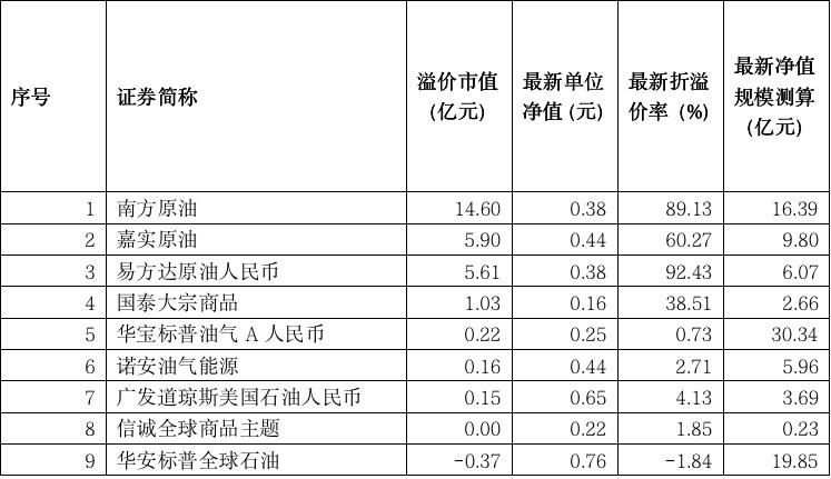 具体来看,南方原油溢价市值最高,约为14.6亿元,嘉实原油、易方达原油人民币溢价市值也超过5个亿,分列二、三位。上述基金的最新折溢价率高企,溢价市值排名前四的产品溢价率皆超过30%。