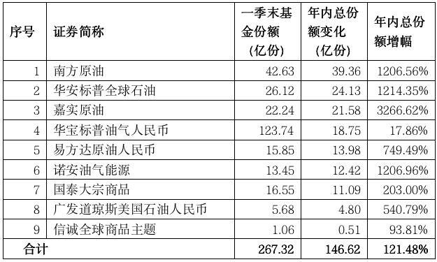 数据显示,截至一季度末,9只油气、商品类基金(A、C份额合并计算)总份额为267.32亿份,是去年末总份额的2.21倍,三个月内该类型产品总份额大增146.62亿份。