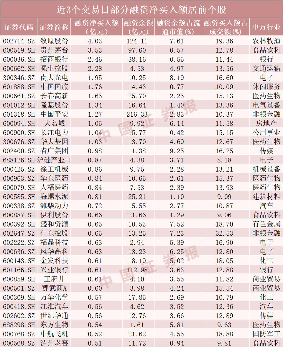 具体到个股,近3个交易日,沪深两市共有685只股票获融资客加仓,12股融资净买入额超过1亿元。其中,牧原股份融资净买入额居首,达4.03亿元;贵州茅台招商银行强生控股融资净买入额分别为3.53亿元、2.46亿元、2.28亿元,南大光电中国国旅长春高新隆基股份中国平安大名城长江电力华大基因融资净买入额也均超过1亿元。