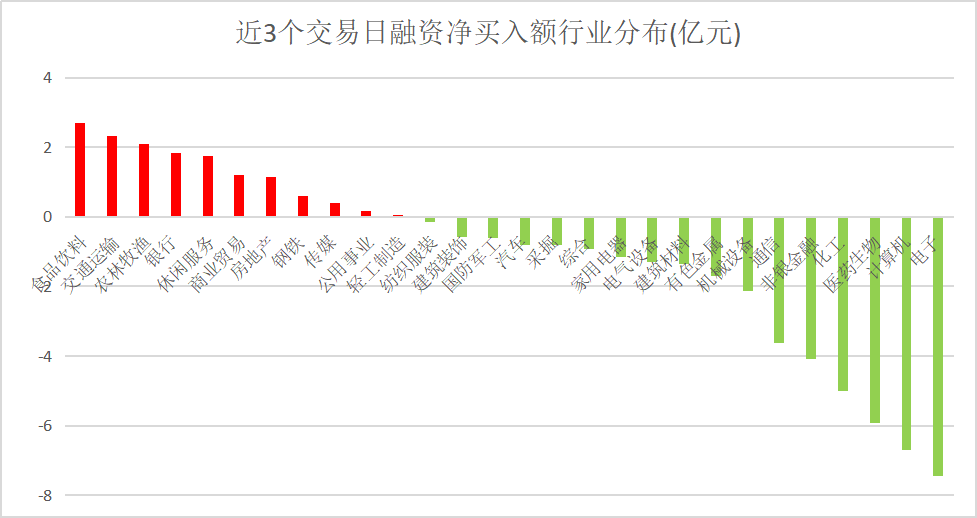 从行业分布来看,近3个交易日,食品饮料、交通运输、农林牧渔行业融资净买入额位列前三,分别为2.70亿元、2.32亿元、2.10亿元;银行、休闲服务、商业贸易、房地产融资净买入额也均超过1亿元,分别为1.83亿元、1.76亿元、1.20亿元、1.14亿元。