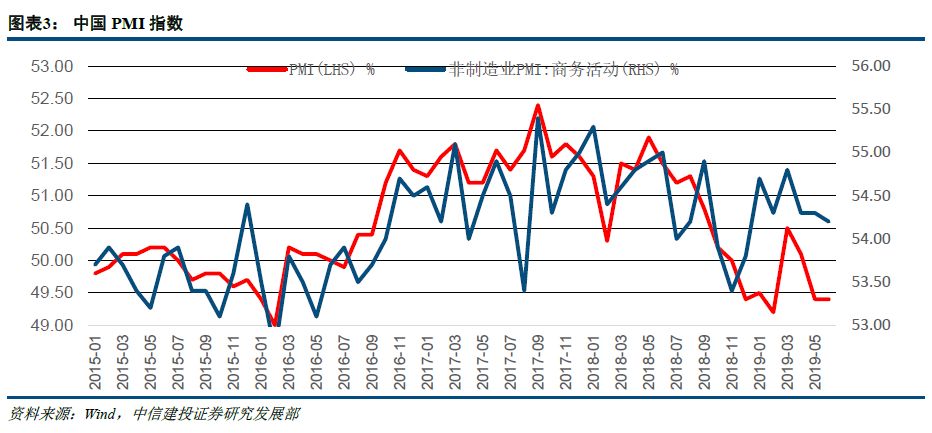 6月30日国家统计局公布了PMI指数。2019年6月中国制造业采购经理指数(PMI)为49.4%,与上月持平,非制造业PMI为54.2,前值54.3。从制造业来看,中国投资活动仍然下行,延续了2019年4月以来经济回落的趋势,非制造业PMI指数仍然处于扩张的过程中。