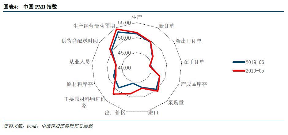 从分项来看,生产经营活动、生产和供应商配送略高于50,新订单、新出口订单、库存等主要分项都在回落的过程中。对比2019年5月和2019年6月经济活动数据可以发现,由于需求的下降,出厂价格仍然持续在下降。我们在《牛市起点》中提出的产出下降的宏观环境又重新显现。