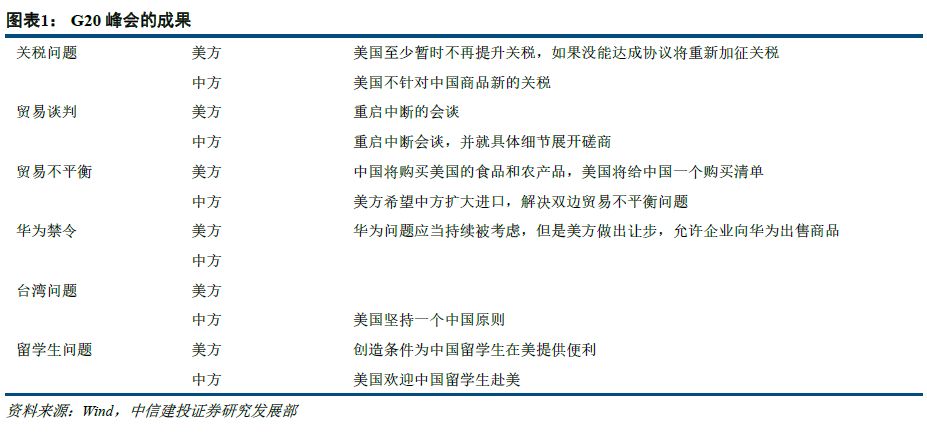 中美双方在经贸问题上均做出了一定程度的让步:美国对剩下的3500亿商品暂时不加征关税,并允许美国企业对华为出口产业链上的商品、中国将扩大进口,购买美国的食品和农产品,解决双方贸易不平衡的问题。虽然中美双方在表述上存在分歧,但重启贸易谈判,并且允许美国企业向华为出口芯片等产品,仍然缓和了双方紧张的局面。