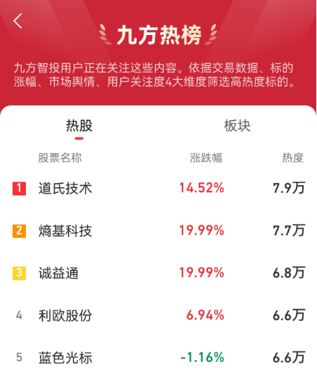 九方热榜:道氏技术,熵基科技,诚意通,利欧股份,蓝色光标