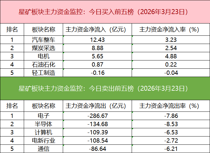 从主力板块资金监控数据来看,汽车整车板块主力资金净流入居首。