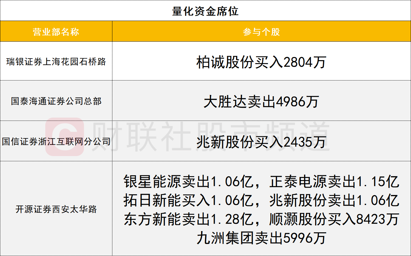 龙虎榜方面,太空光伏概念表现活跃,拓日新能强势涨停,获一家游资(国泰海通证券武汉紫阳东路)买入1.07亿,同时一家量化资金(开源证券西安太华路)买入1.06亿。