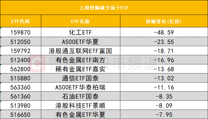 在上周份额减少前十的ETF中,化工ETF(159870)近期份额大减,上周份额减少48.59亿份,近四周份额减少超70亿份。