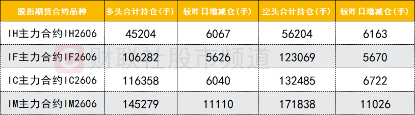四大期指主力合约中,IH、IF、IC、IM合约多空双方均加仓,IC合约空头加仓数量较多。
