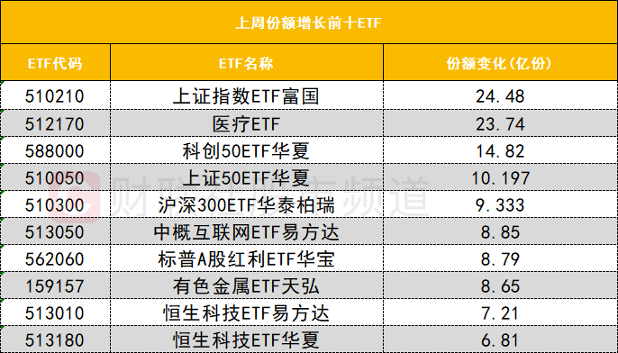在上周份额增长前十ETF中,上证指数ETF富国(510210)上周份额增长24.48亿份位居首位;医疗ETF(512170)上周份额增长23.74亿份位居次席。