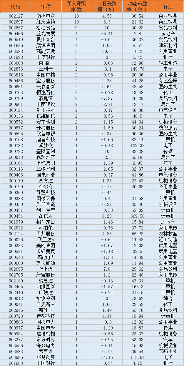 行业来看,计算机、公用事业等行业最受青睐,均有8只个股上榜机构买入评级榜。食品饮料、机械设备等行业也较受机构关注,分别有5只、5只个股上榜。
