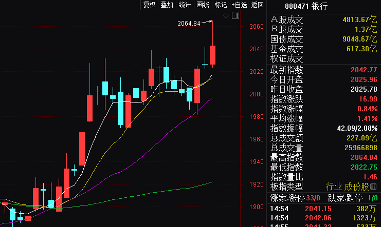 受此利好影响,今日银行板块指数强势上攻,盘中一度上涨近2%,创出1年半多来的新高。盘面上,除刚上市不久的渝农商行因为估值略微偏高,微跌1分钱外,其余个股全线飘红。青岛银行、常熟银行、光大银行等涨幅居前。其中,招商银行、兴业银行创历史新高(复权);常熟银行、杭州银行、江苏银行等均创近年新高。