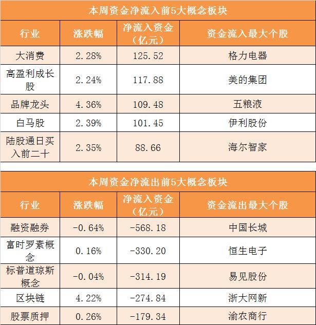 概念板块方面,本周大消费、高盈利成长股、品牌龙头、白马股等概念板块资金呈现净流入,其中大消费概念净流入125.52亿元居首。