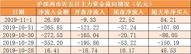 本周两市主力资金累计净流出847.28亿元。其中周五(11月1日)主力资金开盘净流出9.33亿元,尾盘净流入22.52亿元,全天净流入26.89亿元。