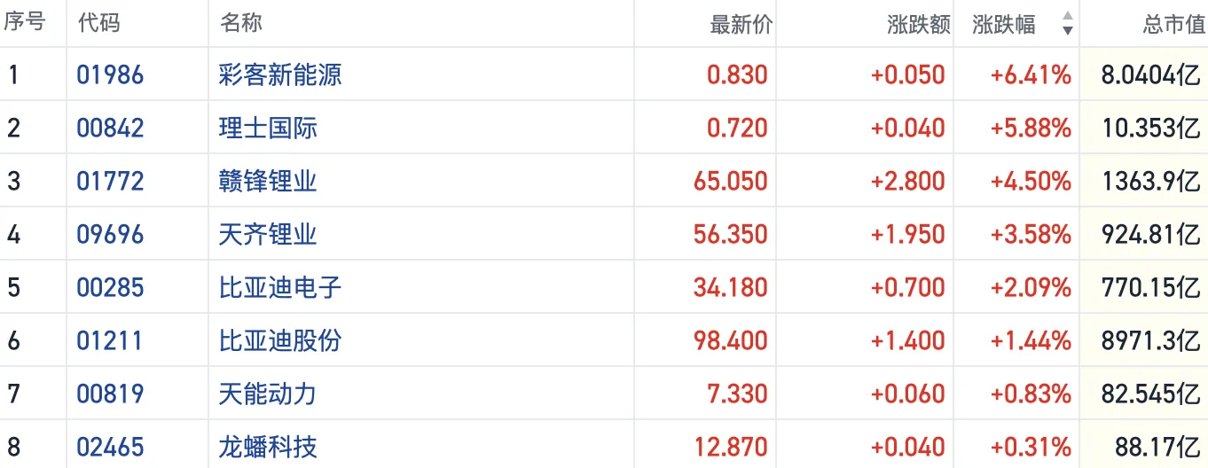截至发稿,彩客新能源(01986.HK)涨超6%,赣锋锂业(01772.HK)涨逾4%,比亚迪电子(01211.HK)等个股也明显上扬。