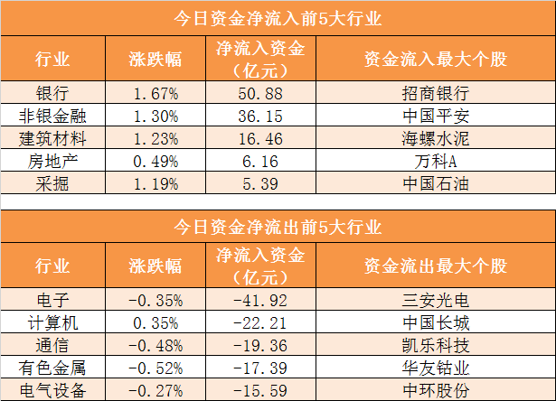 今日沪深两市主力资金开盘净流出31.07亿元,尾盘净流出0.2亿元,两市全天资金净流出26.91亿元。